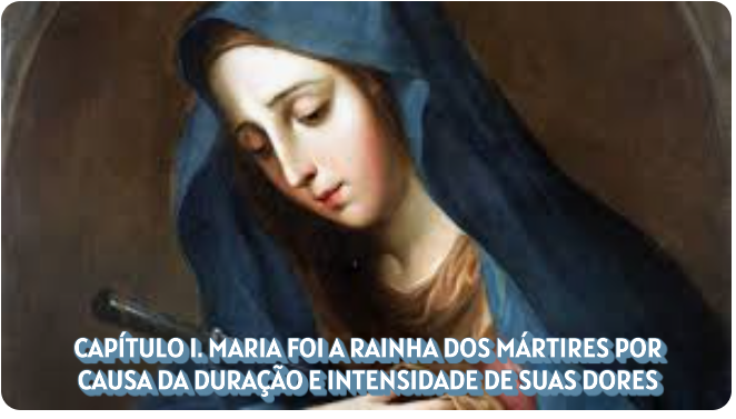 Já sabeis de quem estou falando? Esse Filho, tão cruelmente suplicado, foi Jesus, nosso amoroso Redentor. E essa Mãe foi a bem-aventurada Virgem Maria, que por nosso amor se resignou a vê-lo sacrificado à justiça divina pela crueldade dos homens. Portanto é digna de nossa piedade e gratidão essa dor imensa que Maria sofre por nosso amor. Mais lhe custou sofrê-la, do que suportar mil mortes. E se não podemos corresponder dignamente a tanto amor, demoremo-nos hoje, ao menos por algum tempo, na consideração de suas acerbíssimas dores. Digo, por isso: Maria é Rainha dos mártires, porque as dores de seu martírio excederam às dos mártires 1° em duração; 2° em intensidade.