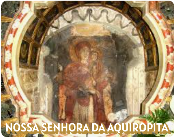 Conta a tradição que, no ano 580, o capitão Maurício, desviado pelos ventos, chegou a uma aldeia da Calábria, em Itália. O monge Efrém foi ao seu encontro e disse-lhe: «Não foram os ventos que te conduziram para cá, mas Nossa Senhora, para que tu – uma vez Imperador – lhe construas um templo.» Dois anos depois, Maurício tornou-se Imperador e construiu a igreja dedicada a Maria. Porém, a imagem de Nossa Senhora, que era pintada durante o dia, de noite desaparecia da parede. Uma noite, uma senhora entrou no santuário. Como demorava a sair, o vigilante foi verificar o que acontecera. Não viu a senhora, mas numa das paredes do templo estava a imagem de Nossa Senhora com traços típicos da mulher calabresa. O povo dirigiu-se de imediato à capela, a aclamar: «Aquiropita! Aquiropita!» (que significa: imagem não pintada por mão humana).