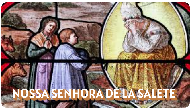 Enquanto Maximin Giraud (onze anos) e Melânia Calvat (quinze anos) cuidavam do rebanho, em La Salete, França, viram Nossa Senhora com as mãos no rosto. Era o dia 19 de setembro de 1846. A chorar a Virgem estava vestida como as mulheres da região: vestido longo, um grande avental, lenço cruzado e amarrado nas costas, touca de camponesa, muitas rosas. Na sua fronte a luz brilhava como um diadema. Dos seus ombros pendia uma pesada corrente. Outra corrente mais leve prendia sobre o peito um crucifixo resplandecente com um martelo, de um lado, e uma turquês, do outro.