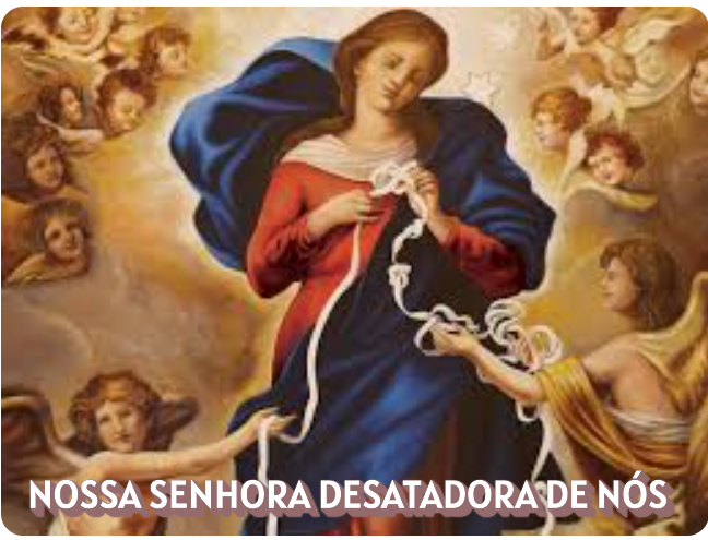 Santa Maria, Desatadora de Nós, cheia da presença de Deus, durante os dias da vossa vida aceitastes com toda a humildade a vontade do Pai e nunca fostes dominada pelo mal. Junto do vosso Filho, intercedestes pelas nossas dificuldades e, com toda a paciência, deste-nos o exemplo de como desenrolar as linhas embaralhadas da nossa vida. Proclamada por Jesus como nossa Mãe, colocais em ordem e fazeis mais claros os laços que nos unem a Ele.